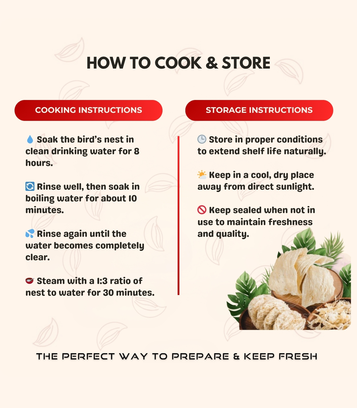 Each nest is hand-harvested, carefully inspected, and certified for compliance. Natural variations in size, colour, and texture are expected and reflect the authentic nature of premium bird’s nest.