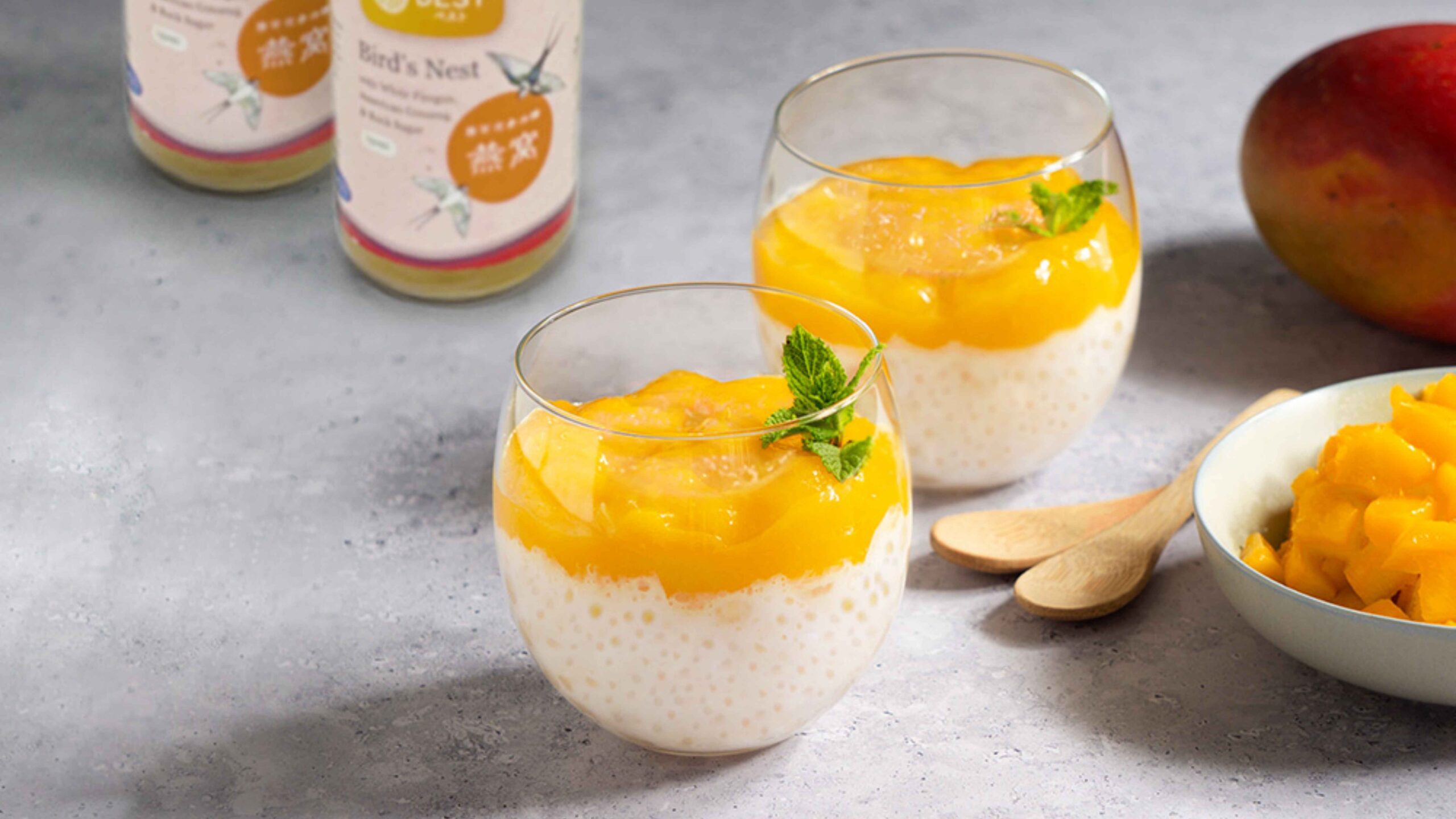 A creamy Bird’s Nest Mango Coconut dessert combining ripe mango, smooth coconut milk and premium edible bird’s nest. Light, tropical and perfect for skin-supporting daily wellness.